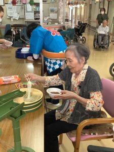 流しそうめん、ナゲットとポテト、ベビーカステラ、かき氷。