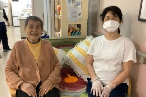 作品と、仲良しの職員さんと 「はいチーズ!」