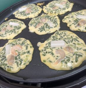ホットプレートを二枚用意し、材料が並べられると皆さんの期待も膨らみます。