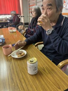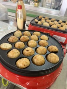 屋台の気分も味わってもらおうと、たこ焼きとノンアルでおやつ。