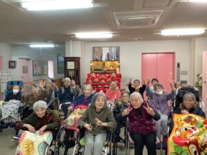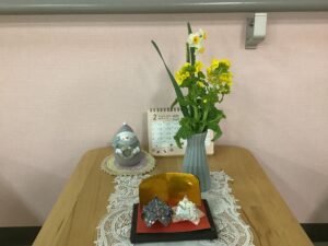まだ肌寒い11日、大安のいい日だったのでデイサービスの利用者さんとおひな様を出しました。
